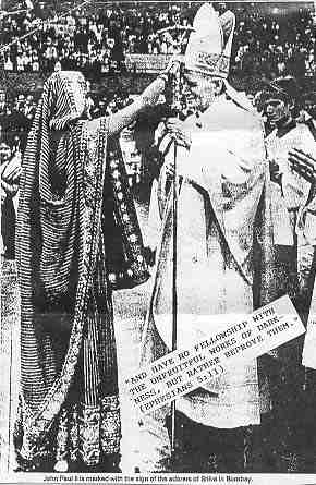 In his visit to Senegal in 1992 where, instead of calling the heathen African religions by their proper and accurate name, Pope John Paul II referred to "African customs" and urged Senegal's Roman Catholics to "strike the right balance between African customs and church requirements." But there is no "right balance" between truth and error -- they are mutually exclusive. Yet the Pope said that the "blending of authentically African fruits in union with the universal church was essential to the spread of Catholicism on the continent." (Source: 4/93, Flashpoint.) [Contrast such statements with the Word of God: "To the law and to the testimony: if they speak not according to this Word, it is because there is no light in them" (Isa. 8:20). God says: "Woe unto them that call evil good, and good evil..." (Isa. 5:20). All idolatry is an abomination to God and needs to be recognized as such. Of course, since the Roman Catholic Church actually worships idols while claiming to be "Christian," it is understandable that they will not rebuke heathen idolaters who make no profession of faith in Christ.]