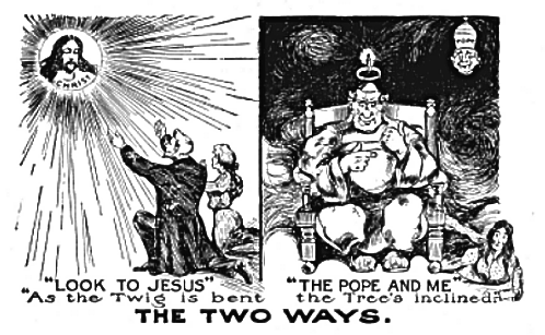 Catholicism is taught her cunning from her childhood, as she is taught to watch the ranks of Protestantism and whenever she finds a weak spot, she turns her forces upon this weakened line, and is further instructed never to weaken in her continual march of devastation.