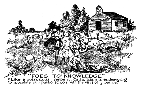 We could go on and quote diabolical denunciations of our public schools from hundreds and thousands of Catholic officials, as the followers of Rome make no "bones" of declaring their animosity towards the public schools of this country, and they are only waiting for the time to arrive when they will be able to wipe from the face of the earth every vestige of our public schools, and place in their stead their parochial schools, which are nothing more nor less than "mills of ignorance" and "institutions of superstition."